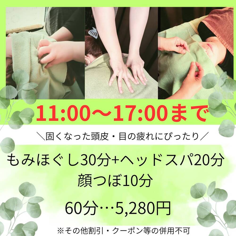 【時間限定】60分☆もみほぐし30分+ヘッドスパ20分+顔つぼ10分…¥5,280