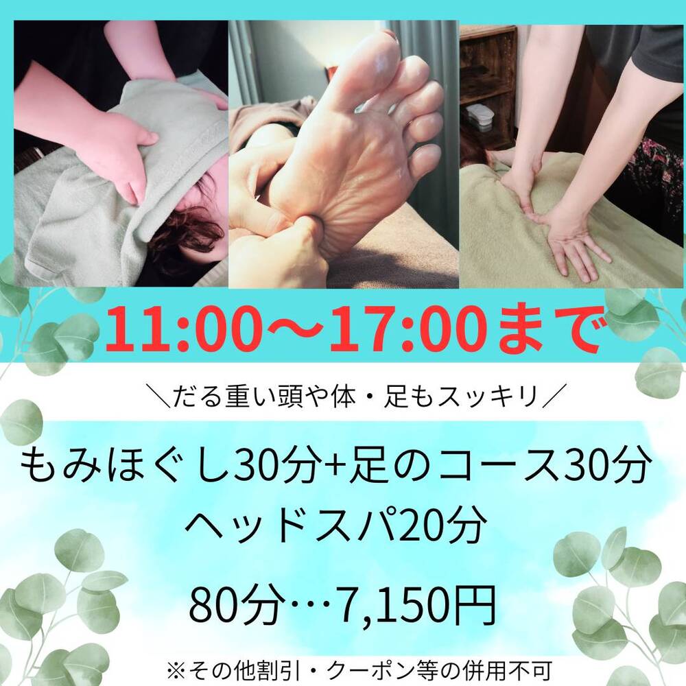【時間限定】80分☆もみほぐし30分+足のコース30分+ヘッドスパ20分…¥7,150