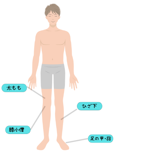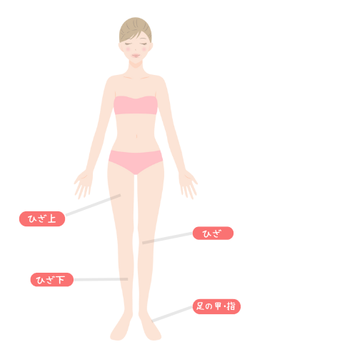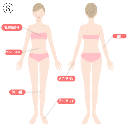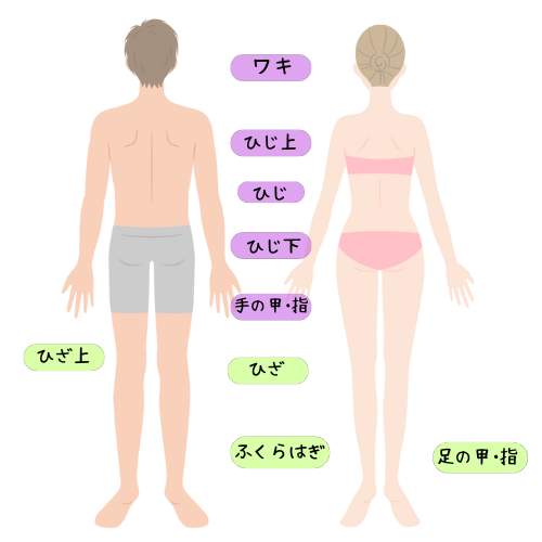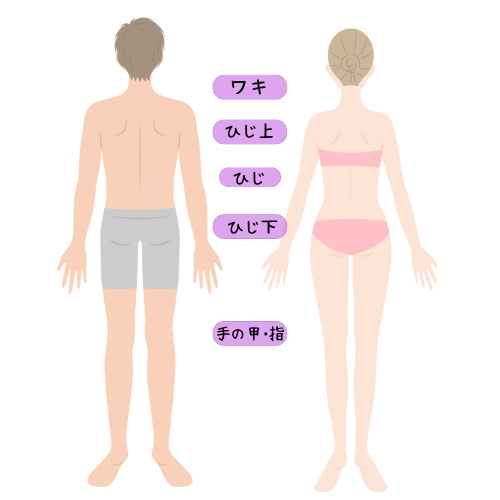 えりあし/手の甲・指/膝小僧/両肘/おへそ周り/乳輪周り(えりあし除く)