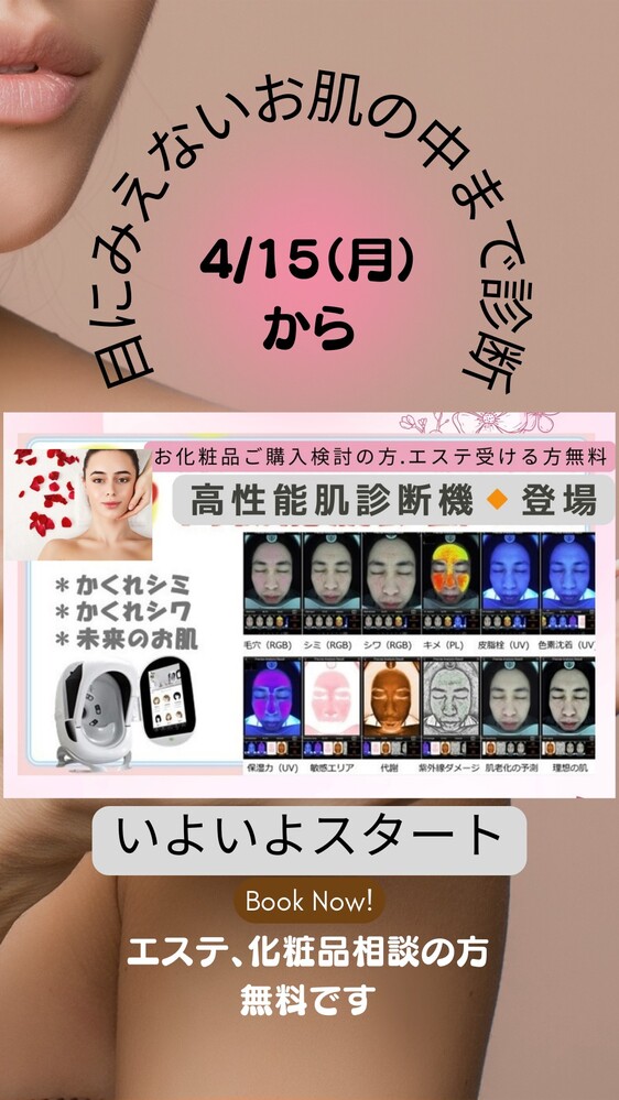 【高性能肌診断機】 隠れシミ隠れシワ未来のお肌までエステor化粧品相談対象¥015 minsエステまたは化粧品ご購入の方が対象となります。