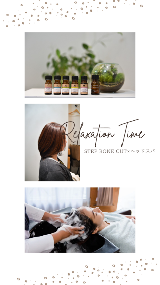 ステップボーンカット+ヒト幹細胞スカルプヘッドスパ+アロマオイルの香り