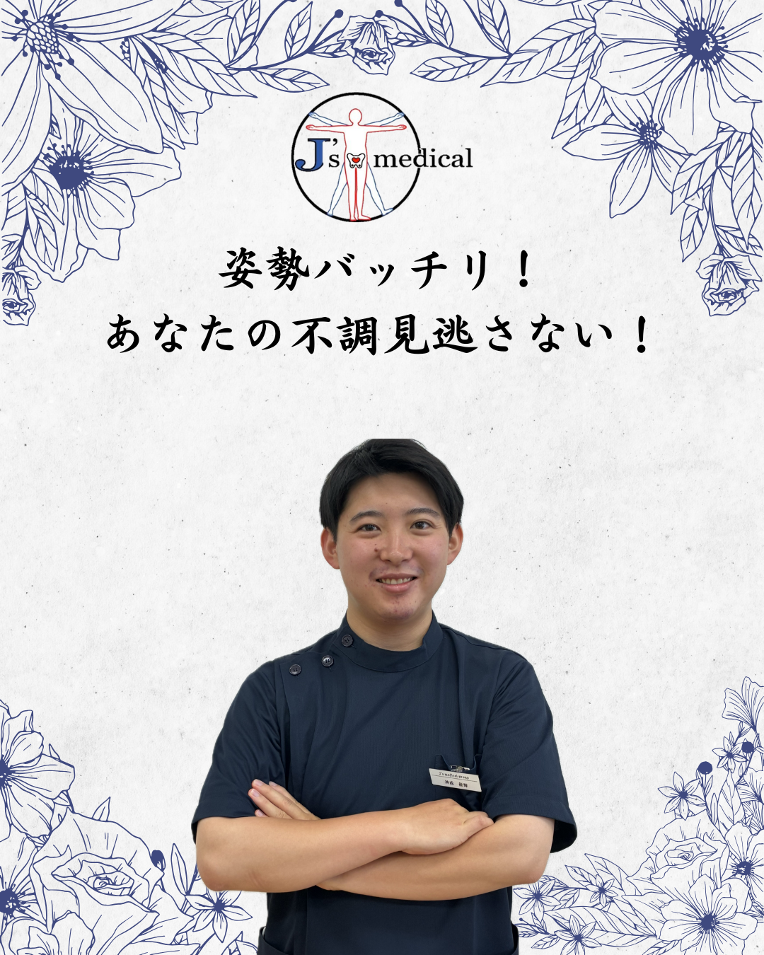 その後、J’sメディカル整体院に就職。 2018年より系列院のJ’sメディカル整体院町田院、門前仲町院、新横浜院、上野院で数多の臨床経験を積んだ後の2025年6月に恵比寿・代官山院へ配属される。