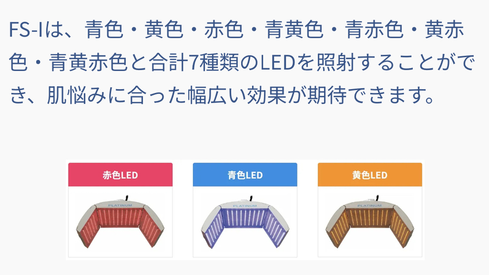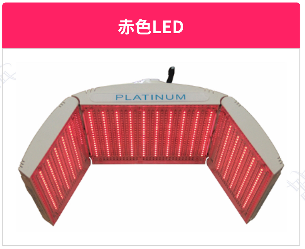 LEDには、赤色 青色 黄色とあり、それぞれシワタルミ改善、若返り効果 ニキビ改善予防効果、肌のきめを整える しみくすみ改善、肌質を正常に整えます。